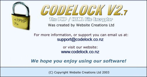 Note: You need to have the ZLIB module installed in PHP before you can fully use the Codelock V2 encryptor. The ZLIB module increases security and is highly recommended.